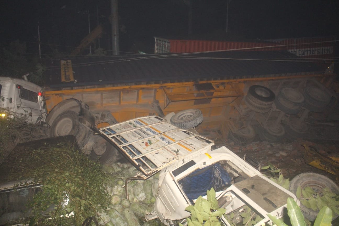 जानकारी के अनुसार बुधवार रात को आशारोड़ी चेक पोस्ट पर सेल्स टैक्स विभाग के अफसर रूटीन चेकिंग कर रहे थे। चेकिंग के दौरान सेल्स टैक्स कर्मचारियों और पीआरडी जवान ने एक यूटिलिटी वाहन को रुकने का इशारा किया। यूटिलिटी के अचानक रुकने से उसके पीछे आ रहे कई वाहन टकराते चले गए। इन वाहनों को तेज रफ्तार कंटेनर ले जा रहे ट्रक ने टक्कर मार दी। पीछे से आ रहे 2 डंपर भी कंटेनर से टकराकर पलट गए। घटनास्थल पर एक कार भी पलटी है। एक बाइक भी टक्कर से क्षतिग्रस्त हो गई। हादसे की सूचना मिलने के बाद थाना क्लेमनटाउन पुलिस ने मौके पर पहुंच कर घायलों को निकाल कर इलाज के अस्पताल भिजवाया।