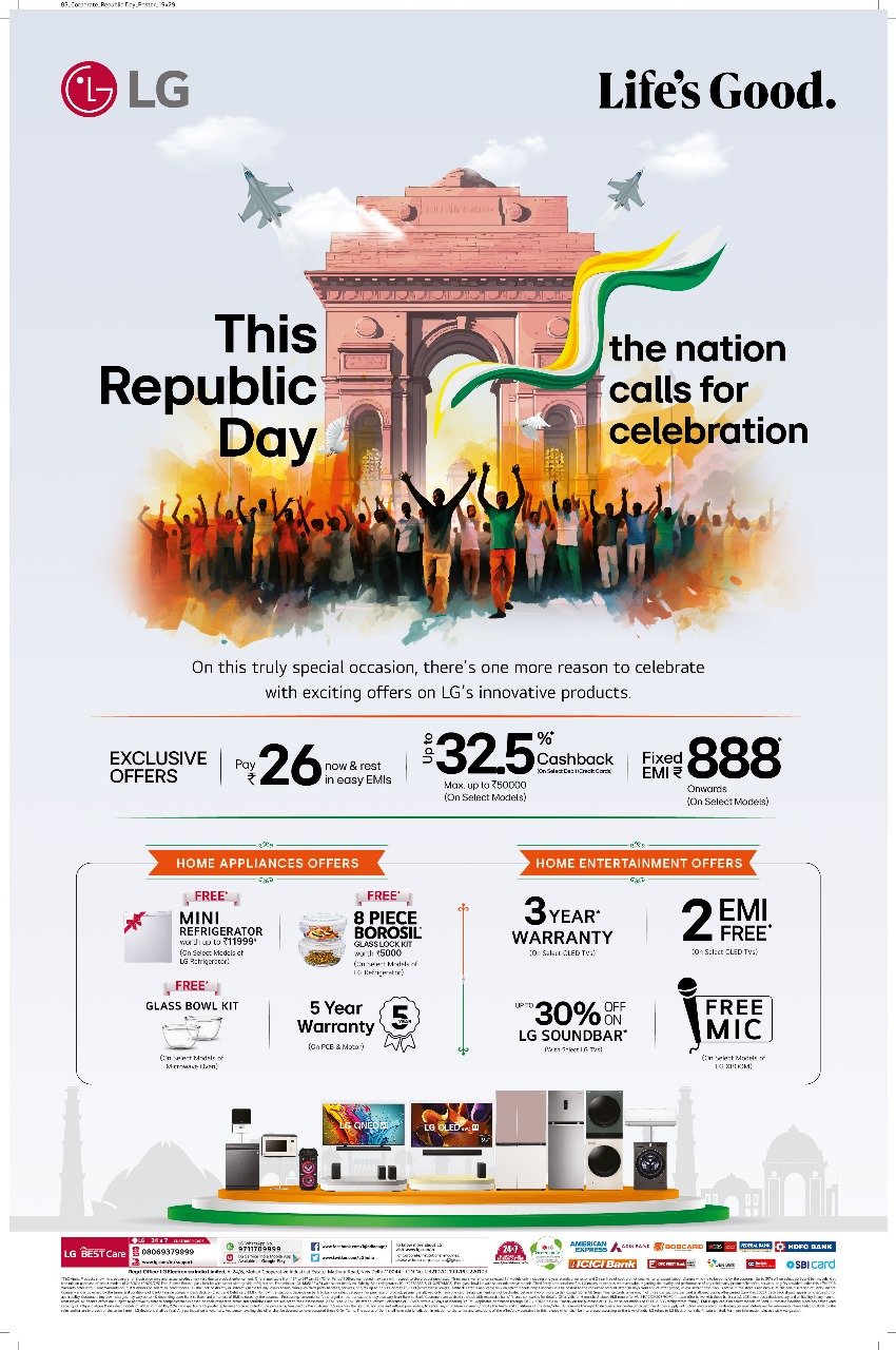 नई दिल्ली: एलजी इलेक्ट्रॉनिक्स इंडिया गणतंत्र दिवस की भावना को समर्पित अपने विशेष अभियान ‘द नेशन कॉल्स फॉर सेलिब्रेशन’ के साथ गर्वित महसूस कर रहा है। यह विशेष प्रमोशन ग्राहकों के लिए कई रोमांचक ऑफर्स और लाभ लेकर आया है, जो इस गणतंत्र दिवस को यादगार बनाने का वादा करता है।