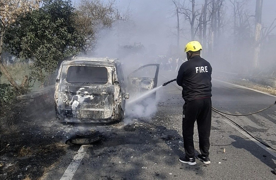 वहीं, कुछ ही देर में कार ने भयंकर आग पकड़ ली और पूरा वाहन आग की चपेट में आ गया। इस दौरान मौके पर वाहनों और यात्रियों की लंबी कतारें लग गई। आग से कार 90 फीसदी जल गई। गनीमत रही कि कोई जनहानि नहीं हुई। वहीं, व्यस्ततम मार्ग होने कारण अन्य वाहनों के लिए भी आग से काफी खतरा था। जिसे समय रहते टाल दिया गया।