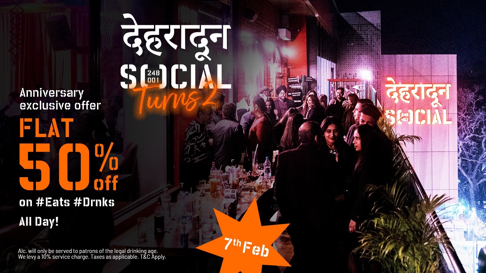देहरादून : देहरादून सोशल अपनी दूसरी वर्षगांठ 7 फरवरी को शानदार अंदाज में मनाने जा रहा है। इस खास मौके पर, ग्राहक पूरे मेन्यू पर 50% की छूट का लाभ उठा सकते हैं, जिससे वे अपने पसंदीदा व्यंजनों और सिग्नेचर कॉकटेल का आधी कीमत पर आनंद ले सकेंगे।