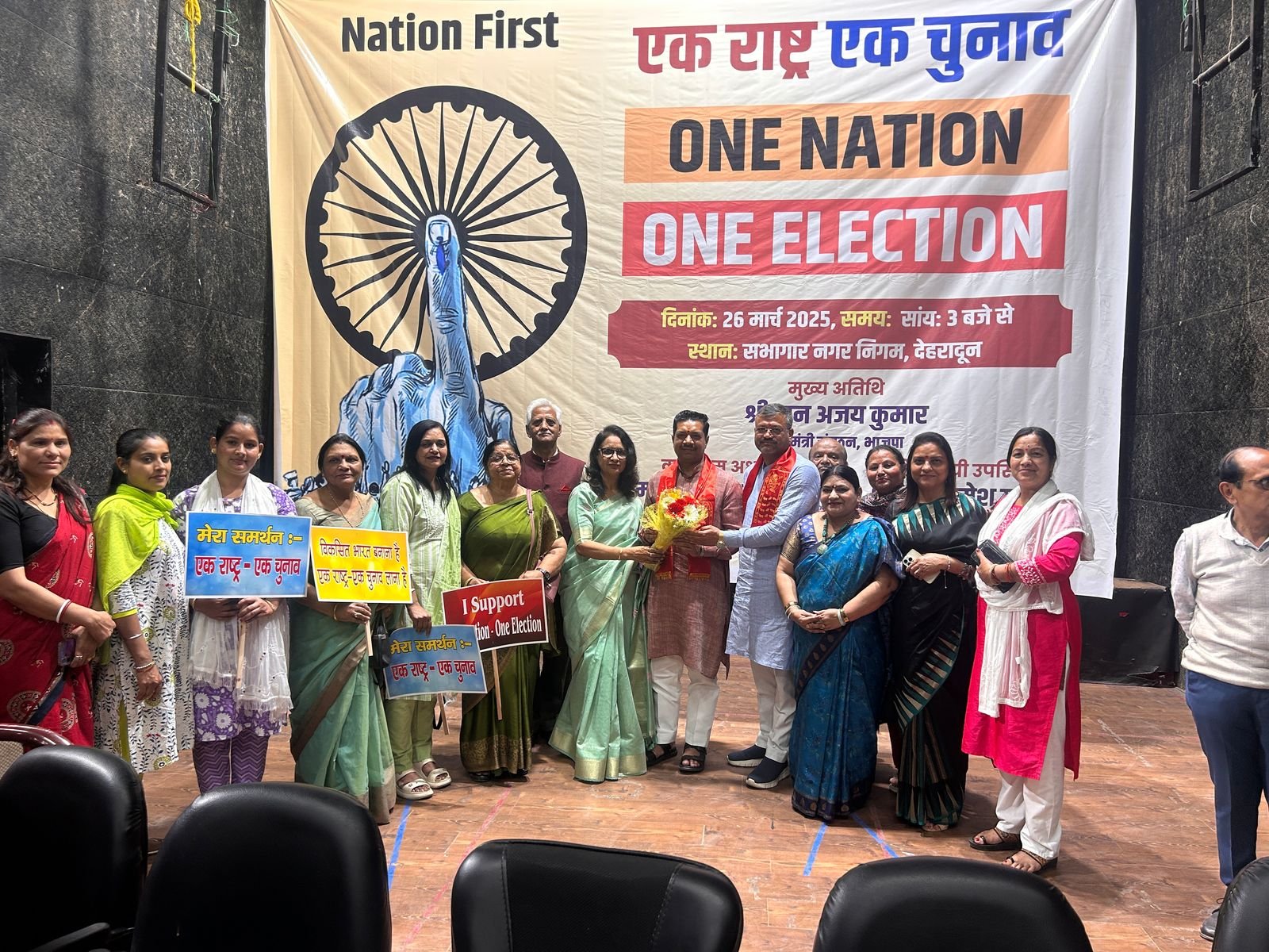 देहरादून। नगर निगम सभागार में बुधवार को एक राष्ट्र एक चुनाव विषय पर परिचय का आयोजन किया गया जिसमें मुख्य अतिथि भारतीय जनता पार्टी के महामंत्री संगठन अजय कुमार मेयर देहरादून सौरभ थपलियाल राज्य मंत्री रमेश गढ़िया मौजूद रहे इस मौके पर विभिन्न संगठनों से मौजूद लोगों ने अपने-अपने विचार रखें ।