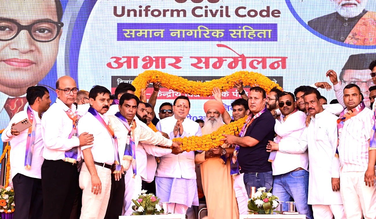 देहरादून। मुख्यमंत्री पुष्कर सिंह धामी को उत्तराखंड में समान नागरिक संहिता (UCC) लागू करने के लिए डॉ. बी.आर. अंबेडकर महामंच द्वारा हरिद्वार में आयोजित कार्यक्रम में सम्मानित किया गया। संविधान निर्माता डॉ. भीमराव अंबेडकर की 135वीं जयंती पर हरिद्वार में बी.एच.ई.एल मैदान में यह कार्यक्रम आयोजित किया गया जिसमें कि चिलचिलाती धूप में बङी संख्या में स्थानीय जनता की जोशपूर्ण मौजूदगी रही। सीएम पुष्कर सिंह धामी ने सम्मान के लिए आभार जताते हुए कहा कि इतनी बङी संख्या में उमङी जनता से जाहिर है कि जनता ने इस साहसिक फैसले पर अपना भरोसा जता दिया है।