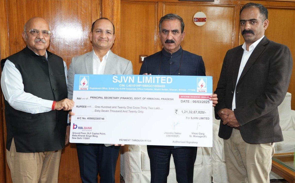 देहरादून। एसजेवीएन, अग्रणी नवरत्न सीपीएसई ने हिमाचल प्रदेश सरकार को वित्तीय वर्ष 2024-25 के लिए 121.33 करोड़ रुपए का अंतरिम लाभांश अदा किया है। अंतरिम लाभांश का चेक आज शिमला में अजय कुमार शर्मा, निदेशक(कार्मिक), एसजेवीएन द्वारा हिमाचल प्रदेश के माननीय मुख्यमंत्री सुखविंदर सिंह सुखू को सौंपा गया। इस मौके पर, ग्रामीण विकास एवं पंचायती राज मंत्री अनिरुद्ध सिंह भी उपस्थित रहे।