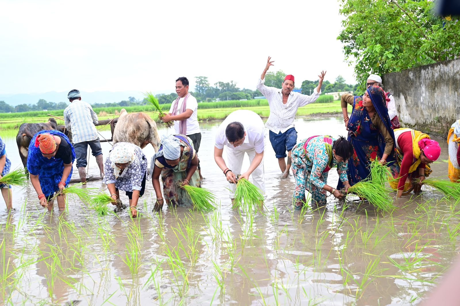 खटीमा। खटीमा के नगरा तराई क्षेत्र में उत्तराखंड के मुख्यमंत्री पुष्कर सिंह धामी ने शनिवार को अपने खेत में धान की रोपाई कर किसानों के परिश्रम, त्याग और समर्पण को नमन किया। उन्होंने कहा कि खेतों में उतरकर पुराने दिनों की यादें ताजा हो गईं। मुख्यमंत्री ने कहा कि अन्नदाता न केवल हमारी अर्थव्यवस्था की रीढ़ हैं, बल्कि वे हमारी संस्कृति और परंपराओं के संवाहक भी हैं।