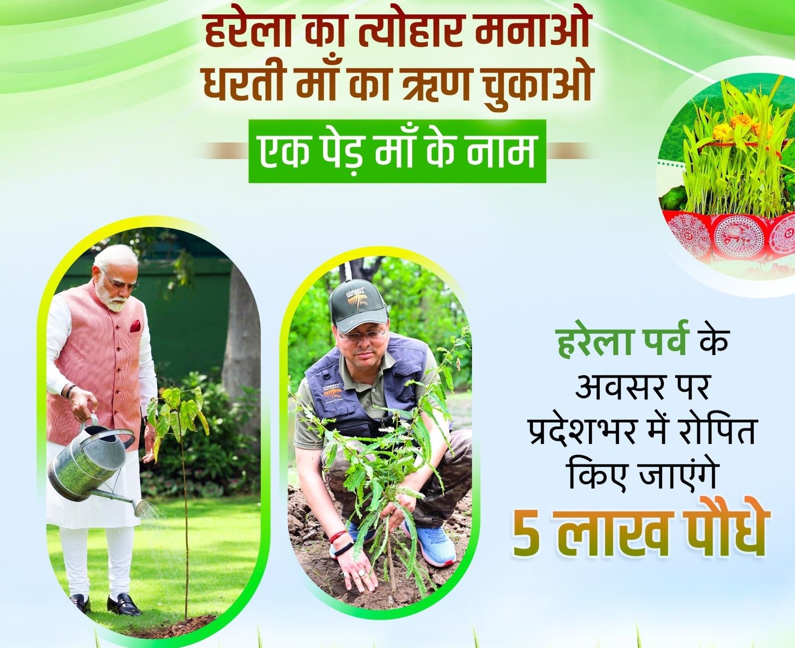 देहरादून । इस वर्ष हरेला पर्व पर उत्तराखंड पौधरोपण पर रिकॉर्ड बनाने जा रहा है। इस दिन पूरे प्रदेश में एक ही दिन में 05 लाख से अधिक पौधे रोपे जाएंगे। जिसमें से गढ़वाल मंडल में 03 लाख और कुमाऊं मंडल में 02 लाख पौधे रोपण का लक्ष्य रखा गया है। इसके लिए शासन स्तर पर सभी तैयारियां पूरी कर ली गई हैं। मुख्यमंत्री पुष्कर सिंह धामी के निर्देश पर इस बार हरेला का त्योहार मनाओ, धरती मां का ऋण चुकाओ और एक पेड़-माँ के नाम की थीम पर यह पौधरोपण आयोजित किया जाएगा। पूरे माह इस पर्व के तहत कार्यक्रमों का आयोजन किया जाएगा।