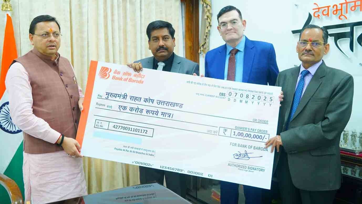 देहरादून। मुख्यमंत्री पुष्कर सिंह धामी से रविवार को मुख्यमंत्री आवास में बैंक ऑफ बड़ौदा के प्रतिनिधि मंडल ने भेंट की। इस दौरान बैंक ऑफ बड़ौदा द्वारा उत्तरकाशी जिले के धराली एवं हर्षिल क्षेत्र में आई आपदा के राहत कार्यों के लिए मुख्यमंत्री राहत कोष में 1 करोड़ रुपये की धनराशि का योगदान दिया। मुख्यमंत्री ने बैंक ऑफ बड़ौदा द्वारा दिए सहयोग के लिए बैंक प्रबंधन का आभार व्यक्त किया।