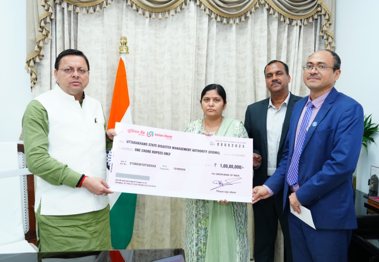 देहरादून । मुख्यमंत्री पुष्कर सिंह धामी से बुधवार को मुख्यमंत्री आवास में यूनियन बैंक ऑफ इंडिया के प्रतिनिधिमंडल ने भेंट की। इस दौरान बैंक द्वारा उत्तरकाशी जिले के धराली एवं हर्षिल क्षेत्र में आई आपदा के राहत कार्यों के लिए ₹1 करोड़ की धनराशि का योगदान दिया गया।