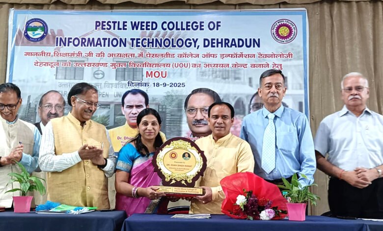 देहरादून। पेसल वीड कॉलेज ऑफ इन्फॉरमेशन टैक्नोलोजी, देहरादून में उत्तराखण्ड मुक्त विश्वविद्यालय के अध्ययन केंद्र बनाये जाने के लिए, उत्तराखण्ड के शिक्षा मंत्री डॉ. धन सिंह रावत की उपस्थिति में, उत्तराखण्ड मुक्त विश्वविद्यालय के कुलपति डॉ. नवीन चन्द्र लोहानी एवं रजिस्ट्रार डॉ. खेमराज भट्ट तथा पेसल वीड कॉलेज के अध्यक्ष डॉ. प्रेम कश्यप ने समझौता ज्ञापन पर हस्ताक्षर किए। इस कार्यक्रम के शुभारम्भ में शिक्षा मंत्री डॉ. धन सिंह रावत, कुलपति (यू.ओ.यू.) डॉ. नवीन चन्द्र लोहानी, कुलसचिव (यू.ओ.यू.) डॉ. खेमराज भट्ट, पेसल वीड कॉलेज के अध्यक्ष डॉ. प्रेम कश्यप, सचिव आकाश कश्यप, प्रबन्धन समिति के सदस्य विनोद शर्मा तथा मेजर जनरल शम्मी सबरवाल, किरन कश्यप, राशि कश्यप तथा पेसल वीड कॉलेज की प्राचार्या डॉ. अनिता वर्मा जी के द्वारा दीप प्रज्वलन से किया गया। तत्पश्चात छात्रों द्वारा रंगारंग कार्यक्रम की प्रस्तुति की गयी। सभी अतिथिगणों को महाविद्यालय की प्राचार्या डॉ. अनिता वर्मा द्वारा पुष्पगुच्छ एवं शॉल प्रदान कर स्वागत किया गया।