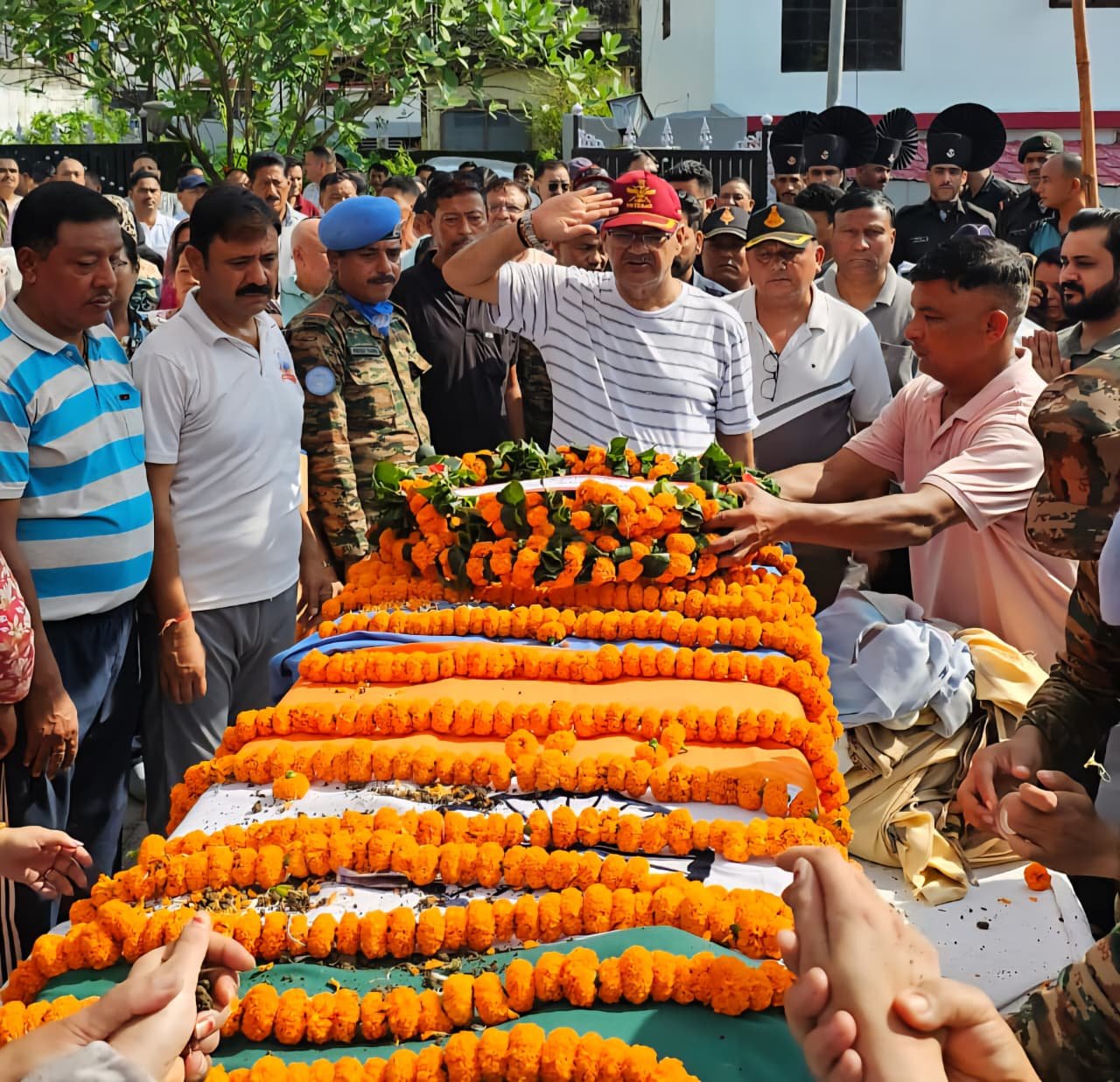 सैनिक कल्याण मंत्री गणेश जोशी ने नायक सूबेदार सुजीत कुमार प्रधान के पार्थिव शरीर पर किए पुष्पचक्र अर्पित