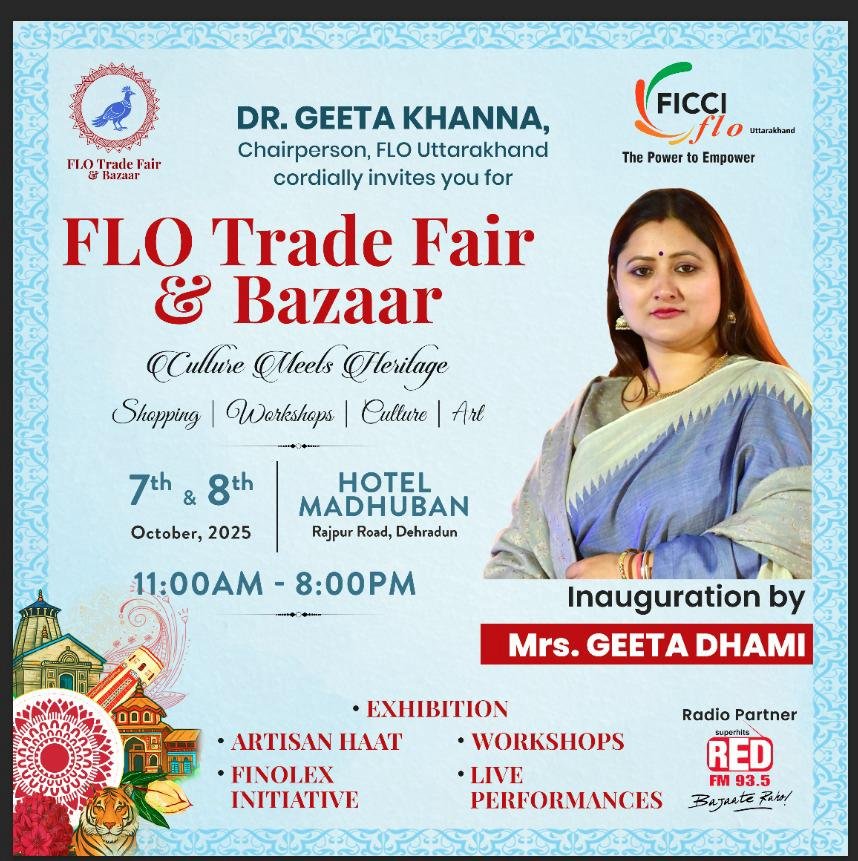 देहरादून | फिक्की फ्लो उत्तराखंड अपने बहुप्रतीक्षित प्रमुख आयोजन “फ्लो ट्रेड फेयर एंड बाज़ार” के 9वें संस्करण का भव्य आयोजन 7 और 8 अक्टूबर 2025 को करने जा रहा है। इस आयोजन का नेतृत्व फिक्की फ्लो उत्तराखंड की अध्यक्षा डॉ. गीता खन्ना करेंगी। कार्यक्रम का आयोजन होटल मधुबन, राजपुर रोड, देहरादून में होगा, जो सुबह 11 बजे से रात 8 बजे तक चलेगा। बारिश को ध्यान में रखते हुए पूरा आयोजन इंडोर रखा जाएगा, ताकि आगंतुक बिना किसी असुविधा के इस कार्यक्रम का आनंद ले सकें। फ्लो उत्तराखंड की टीम ने सभी व्यवस्थाएँ इस प्रकार की हैं कि मौसम की परवाह किए बिना हर कोई आरामदायक माहौल में शॉपिंग, कला और संस्कृति का अनुभव कर सके। डॉ. गीता खन्ना ने कहा कि हमने यह सुनिश्चित किया है कि बारिश लोगों के उत्साह में बाधा न बने। पूरा आयोजन अंदर आयोजित किया जाएगा ताकि हर आगंतुक सुरक्षित और सहज वातावरण में इस भव्य मेले का आनंद उठा सके। यह दो दिवसीय आयोजन महिला उद्यमियों, शिल्पकारों और स्थानीय व्यवसायों को एक साझा मंच प्रदान करेगा और साथ ही भारत की समृद्ध सांस्कृतिक धरोहर और कला परंपरा का उत्सव मनाएगा। कार्यक्रम का मुख्य उद्देश्य महिलाओं की आत्मनिर्भरता, आर्थिक स्वतंत्रता और सशक्तिकरण को प्रोत्साहित करना है। इस मेले में आभूषण, जीवनशैली उत्पाद, हस्तशिल्प, गृह सज्जा, फर्निशिंग, फैशन और अन्य क्षेत्रों से जुड़े विशेष स्टॉल्स लगाए जाएंगे। “आर्टिजन हाट” में देशभर से आए 20 राष्ट्रीय स्तर पर प्रसिद्ध शिल्पकार अपनी कला का प्रदर्शन करेंगे, जिनमें पद्मश्री सम्मानित और यूनेस्को द्वारा मान्यता प्राप्त कलाकार भी शामिल होंगे। ये कलाकार लाइव डेमो और वर्कशॉप्स भी आयोजित करेंगे। भव्य उद्घाटन समारोह में गीता धामी मुख्य अतिथि के रूप में शामिल होंगी।