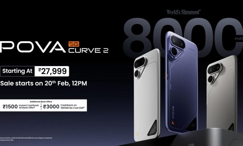 POVA Curve 2 8GB + 128GB साठी ₹27,999 आणि 8GB + 256GB साठी ₹29,999 मध्ये उपलब्ध असेल, ज्यामध्ये आघाडीच्या बँक आणि NBFC भागीदारांकडून ₹3,000 पर्यंत कॅशबॅक मिळेल. प्री-बुकिंग 13 फेब्रुवारीपासून सुरू होईल आणि 19 फेब्रुवारीपर्यंत सुरू राहील. विक्री 20 फेब्रुवारीपासून फ्लिपकार्ट आणि भारतातील प्रमुख रिटेल स्टोअरमध्ये सुरू होईल.