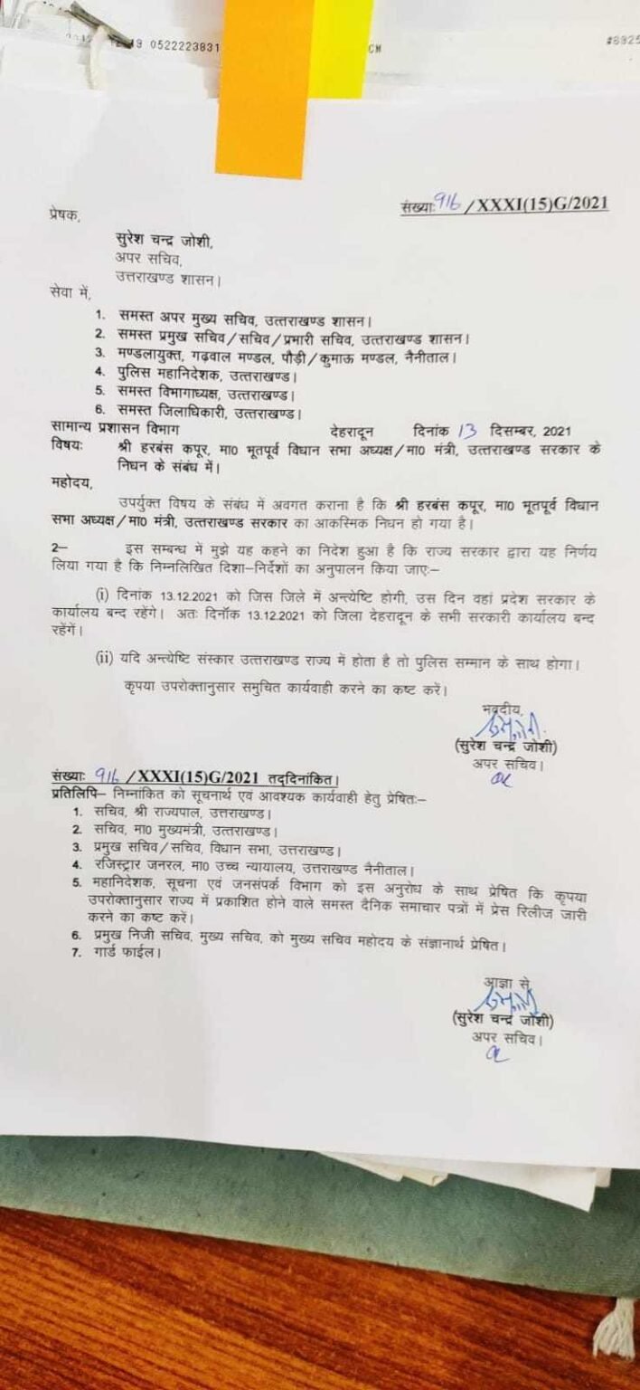 विधायक हरबंस कपूर के निधन पर देहरादून में आज सभी सरकारी दफ्तर बंद करने के आदेश